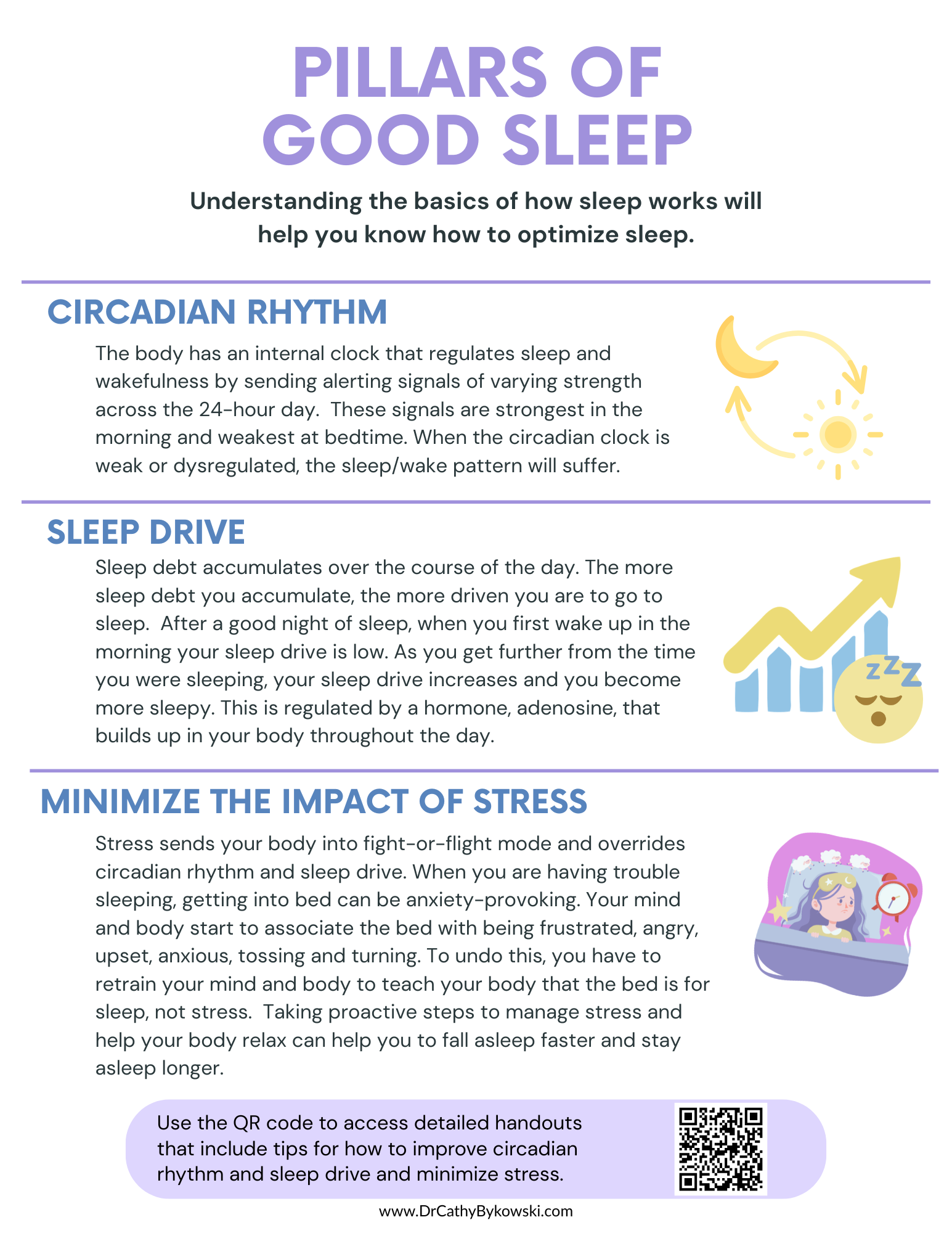 Enter your email address below and I will email you a pdf with more specific tips about how to improve your circadian clock, increase your sleep drive, and teach your body that the bed is for sleep, not stress.
