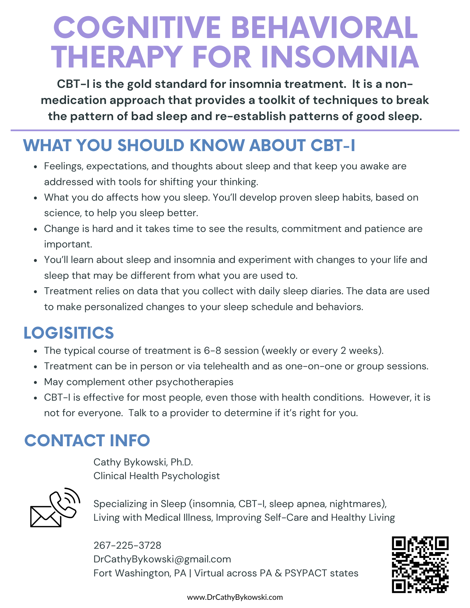CBT-I is a short-term, evidence-based therapy that helps you focus on the thoughts, feelings, and expectations about sleep that are keeping you up at night. Using the science of sleep and the data that you collect about your particular sleep patterns, I will help you identify things that you can do to start sleeping better. Unlike medication that may help you fall asleep, CBT-I gets to the underlying problems so you can fix them for good, without any scary side effects.